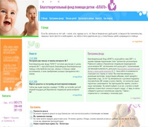Но главное здесь не оформление, а наполнение. Это не реклама, не стремление что-то продать — это голая правда о тех сторонах жизни, которые мы можем и должны изменить. Как? «Благо» предлагает на Ваш выбор ряд программ помощи детям, ознакомиться с которыми Вы сможете в соответствующих разделах: «Программы фонда» и «Как помочь». В том, как легко нам сделать этих сирот счастливыми, Вы сможете убедиться, зайдя в раздел «Письма детей», сопровожденному фоторепортажем, а в том, что наше участие жизненно необходимо — просмотрев фильм. Узнать больше о самом Фонде, его деятельности и насущных нуждах помогут разделы «О Фонде» и «Новости». Не закрывайте глаза, не отворачивайте лица, не проходите мимо того, мимо чего нельзя пройти.