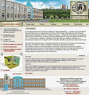 Главная страница содержит общие сведения, график выставок, тематические внеплановые выставки, семинары и конференции, реклама выставок и дополнительную информацию. Ознакомиться с более подробной информацией о каждом из этих разделов, можно прейдя к ним по ссылке. В блоке «О выставке» представлена общая информация о выставках, участниках и посетителях, особенностях участия, конкурсах и наградах и т. д. Блок «Новости» содержит информацию о предстоящих или прошедших выставках, а так же информацию об участниках выставок. В разделе «Услуги» Вы можете ознакомиться с товарами и расценками на услуги, которые предоставляет экспоцентр. Раздел «Контакты» оснащен подробной схемой проезда, контактными данными, а чтобы отправить письмо, воспользуйтесь разделом «написать письмо».