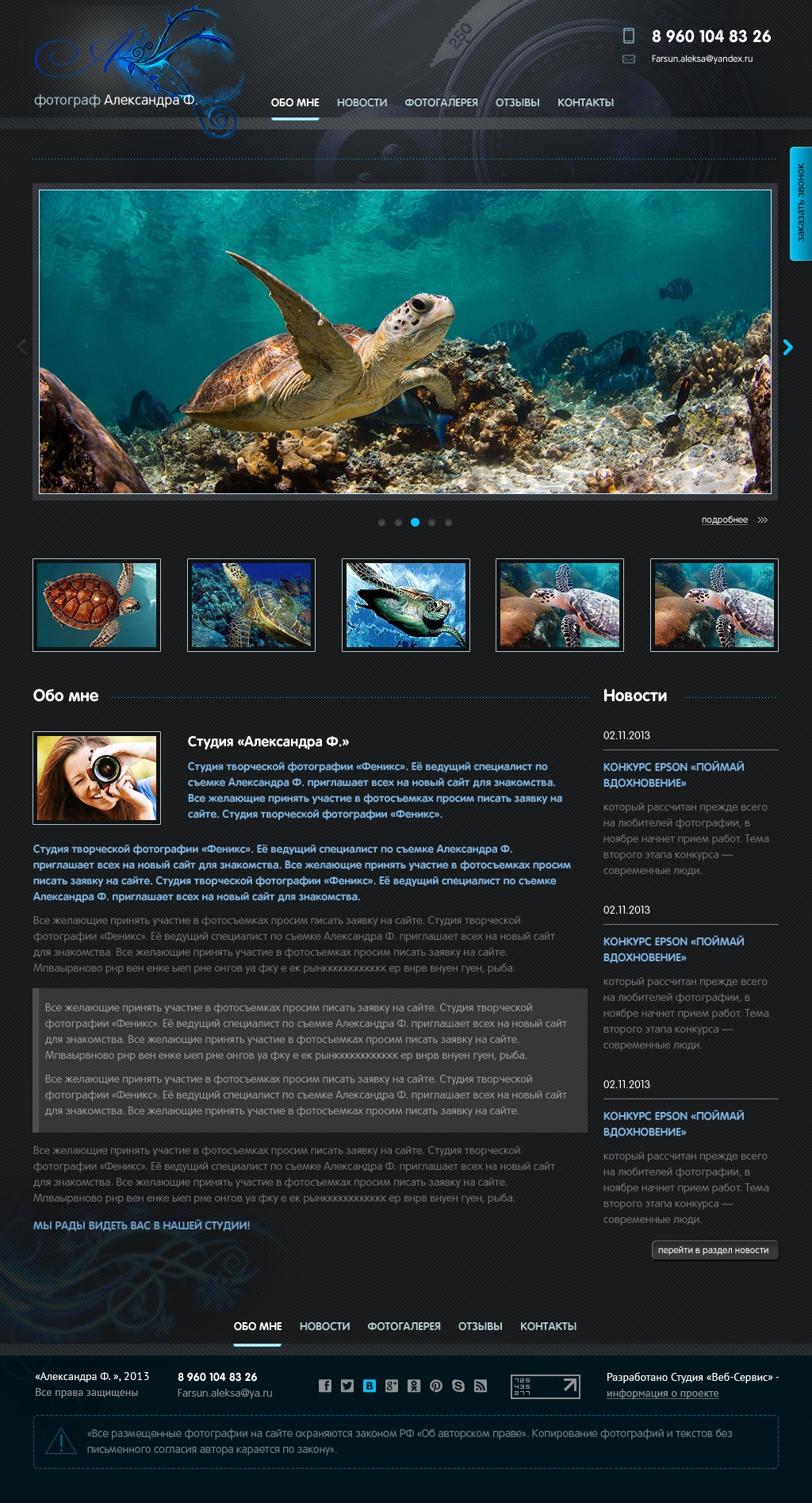 Безусловно, изюминкой сайта являются красивые профессиональные снимки, которые видны пользователю с первого взгляда. Поэтому, чтобы подчеркнуть яркость и контрастность фотографий, в дизайне страниц использован черный фон. Кроме того, для удобства просмотра фотогалереи, в функционале сайта есть опция увеличения и уменьшения изображения. Несмотря на темный фон страниц, текст удобен для чтения, благодаря правильно подобранному шрифту и его цветовому решению. На баннере, размещенном на главной странице сайта, пользователь может увидеть основные проекты и акции, проводимые студией. Также для удобства обратной связи на сайте установлена функция «Заказать звонок», которая позволяет посетителю связаться со специалистами студии в кратчайшее время.