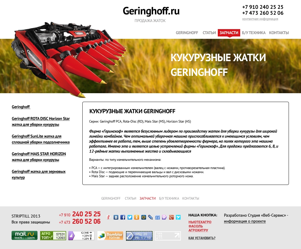 Визуальное оформление данного сайта формируют у пользователя четкое представление о ресурсе. Первое, что бросается в глаза — изображение оборудования для жатки кукурузы. Этот акцент сразу сообщает пользователю, о чем пойдет речь. При наведении курсора на меню, происходит смена цвета. Этот эффект довольно часто используется веб-мастерами для привлечения внимания пользователя. На сайте сложно заблудиться — на какой странице вы не находились бы, удобная навигация подскажет вам обратный путь.