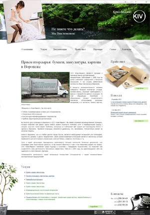Каким должен быть сайт, тематикой которого является вторсырье? Первое – с чувством юмора, второе – с ощущением чистоты и свежести, символизирующих безотходность производства, третье – без самого вторсырья здесь не обойтись. Сайт компании Киво-Маркет – наглядное тому подтверждение: чистые зеленый и белый основные цвета, водопады и зелень в сочетании с использованной бумагой, атака последней на человека – тут есть все.