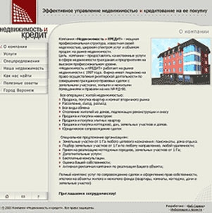 При разработке сайта использовался фирменный стиль компании: логотип, фирменные цвета (бордовый, теплый коричневый, бежевый). Flash-элемент, встроенный в логотип, привлекает внимание: при наведении на него мышкой и нажатии на пункт меню он, поворачивается, превращаясь в объемный куб. А девиз компании — «Эффектное управление недвижимостью и кредитование на ее покупку» — в это же время «вырисовывается» слово за словом, делая сайт более зрелищным. Соблюдая фирменный стиль, название «Недвижимость и кредит» решено было выделить во всём тексте (контенте) особым шрифтом с буквой «И» цвета бордо по середине названия. Гладкий переход серого цвета от темного в светлые оттенки делает графику более объемной и удобной для восприятия, как бы «закругляя» углы и четкие линии.