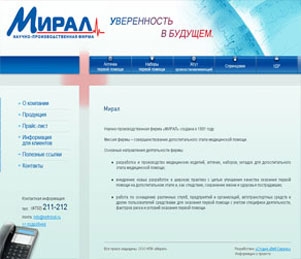 Рисованные иконки, расположенные в верхней части главной страницы, визуально акцентируют внимание посетителя на разделах Продукции, чтобы он быстро мог перейти к товарам, которые необходимы. Таким образом, пользователь сайта оперативно, понятно и исчерпывающе получает необходимую ему информацию о продукции НПФ «МИРАЛ»!
