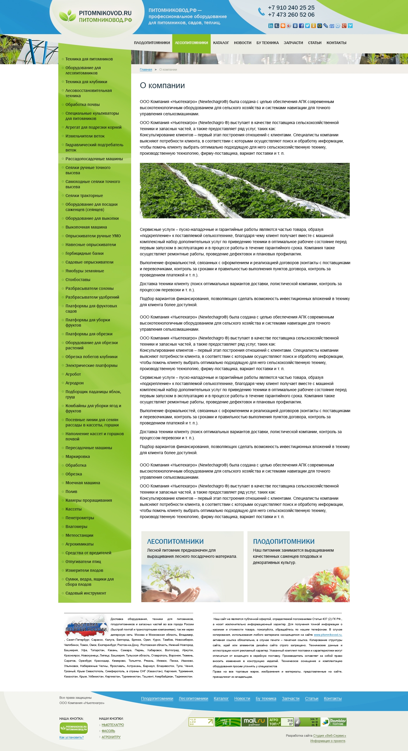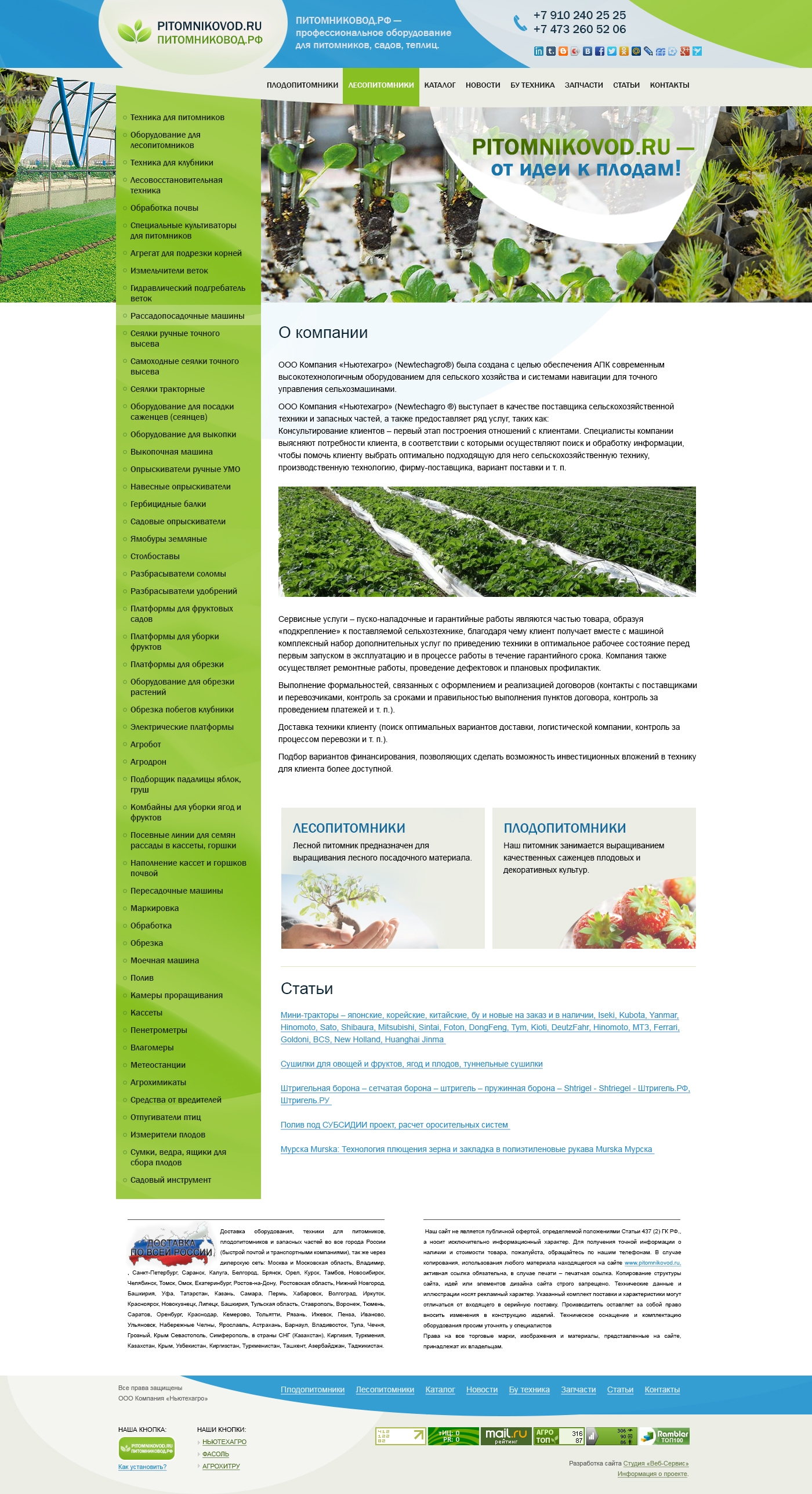 Компания «Ньютехагро» — это надежное предприятие, сфера деятельности которого постоянно расширяется, радуя новыми возможностями своих клиентов. Очередной сайт компании, посвященный профессиональному оборудованию для питомников, садов, теплиц, стал очередным проектом нашей студии. Как и всегда, мы подошли к работе внимательно и ответственно, ставя перед собой цель создать качественный, удобный и информативный ресурс для интернет-пользователей. Для этого на главной странице сайта нами были размещены не только каталог продукции и подразделы ресурса, но и два проиллюстрированных информационных блока: «лесопитомники» и «плодопитомники», а также колонка полезных статей, позволяющая более подробно ознакомиться с деятельностью компании. Кроме того, для облегчения восприятия информации сайт выполнен преимущественно в светлых «природных» тонах.
