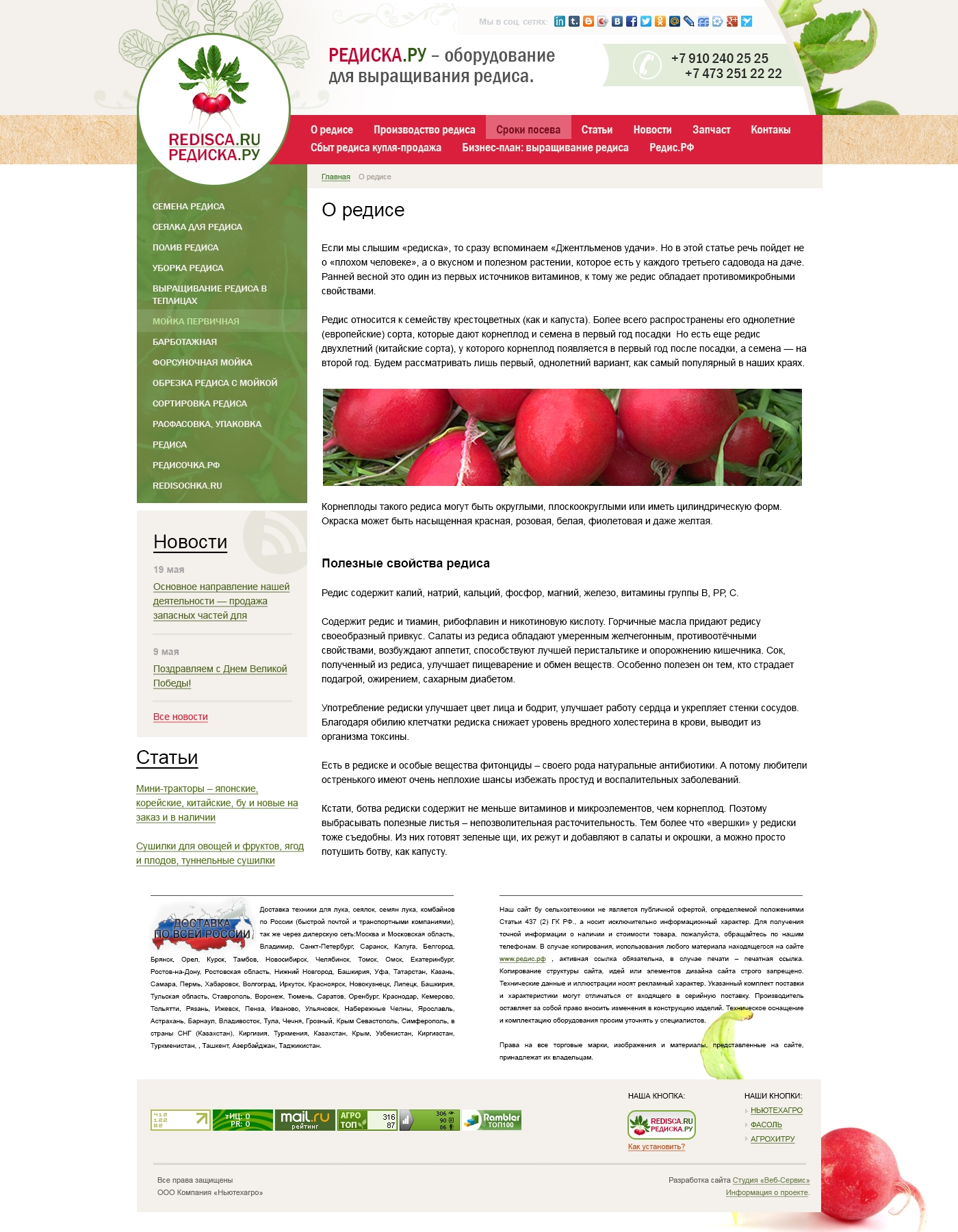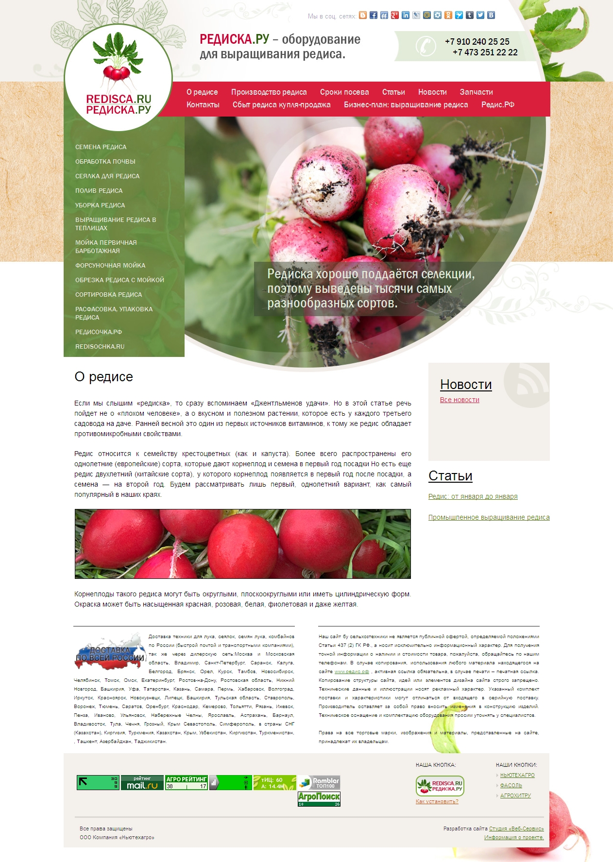 ООО Компания «Ньютехагро», как известно, никогда не останавливается на достигнутом, а потому мы рады представить вам новый ресурс, посвященный оборудованию для выращивания редиса. При входе на новый сайт сразу же бросается в глаза яркий промо-баннер, информирующий посетителя о характере деятельности компании. На главной странице удобно расположились подробный каталог продукции, блок новостей, а также большое количество подразделов. Дизайн сайта отличается лаконичностью, простотой и высокой информативностью, что так важно для быстрого и удобного поиска нужной информации. Кроме того, на сайте редис.рф у каждого посетителя есть уникальная возможность поделиться понравившейся ему информацией с коллегами, партнерами или друзьями при помощи социальных сетей.