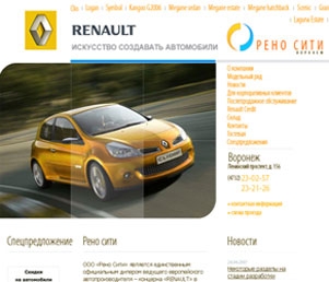Интернет-представительство компании «Рено Сити» разработано в фирменных цветах салона: оранжевом, голубом и белом. Концепция сайта, выполненного в классическом деловом стиле, состоит в том, чтобы максимально заинтересовать пользователей услугами салона, что достигается с помощью удобной системы навигации и тщательной систематизации представленной на сайте информации. Однако сайт не лишен динамики и привлекательности для посетителей: яркие изображения автомобилей и интересные flash-элементы делают интернет-представительство более запоминающимся и приятным для глаза.