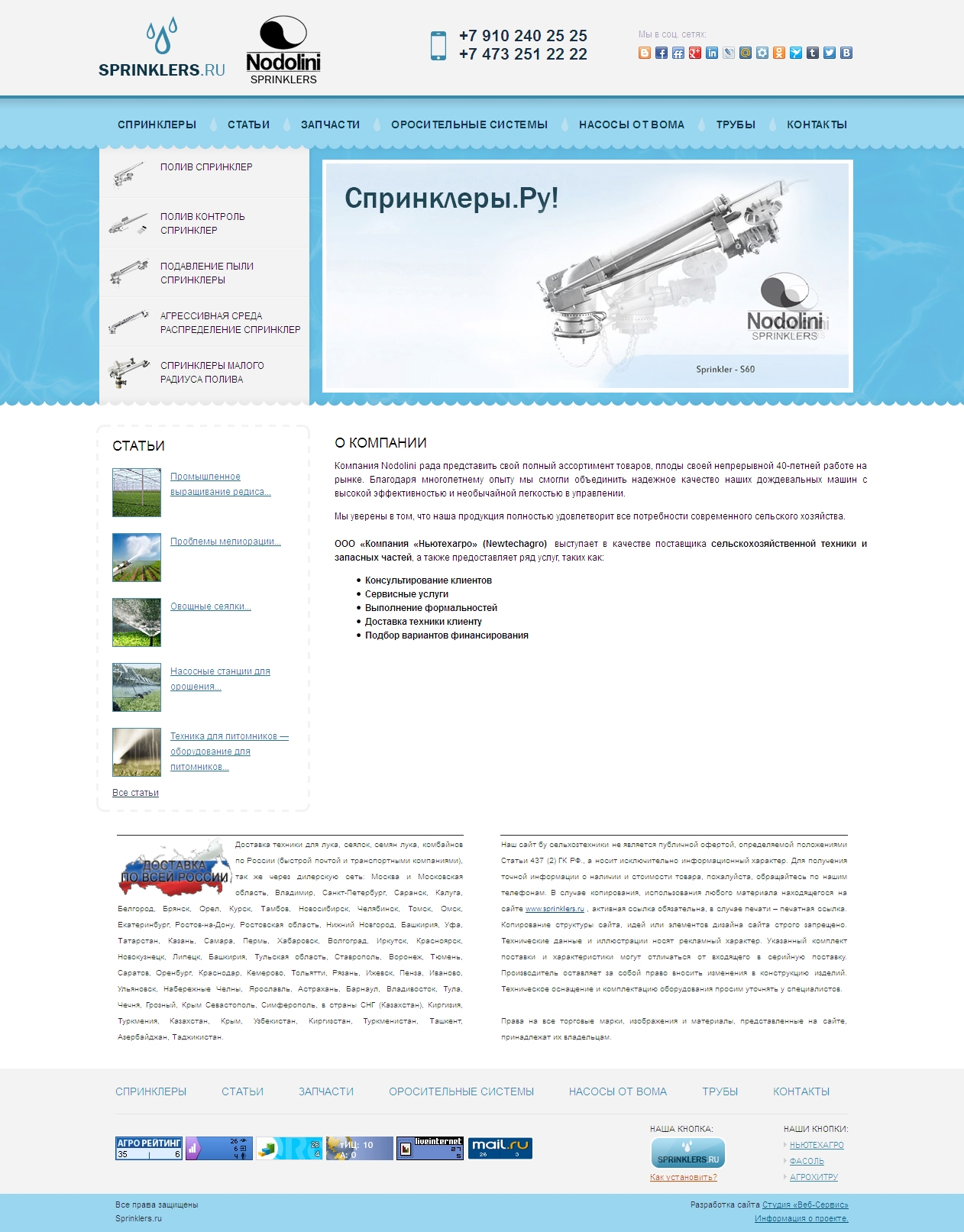 Новый сайт компании ООО «Ньютехагро» sprinklers.ru, разработанный студией «Веб-Сервис» и посвященный актуальным в летний сезон спринклерам и дождевальным машинам, — это очередной этап компании на пути к качественной и успешной работе в сфере сельского хозяйства. Сайт отличается простотой и лаконичностью, здесь «нет ничего лишнего», что могло бы отвлечь покупателя от его цели. Вся необходимая информация расположена на главной странице: подробный каталог продукции, тематический баннер, полезные статьи и контакты компании. Легкий дизайн, оформленный в светло-голубых тонах, облегчает восприятие читателя, делая его пребывание на сайте приятным и интересным.