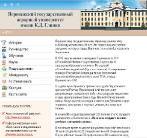Сайт содержит огромное количество информации обо всех направлениях деятельности и об университете в общем: история университета, информация о руководстве, подробное описание факультетов и условий обучения, основные направления научной деятельности госагроуниверситета, список адресов всех корпусов и общежитий университета и многое другое. В Гостевой книге вы сможете оставить свое сообщение. Сайт Воронежского государственного аграрного университета — это хороший пример качественного веб-сайта крупного высшего учебного заведения.
