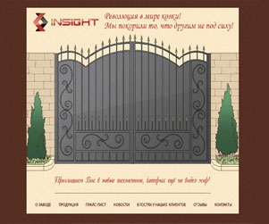 Интернет-представительство завода «Инсайт» выдержано в теплых, приятных для глаза и восприятия тонах, от красного и коричневого до бежевого, что призвано отразить специфику деятельности предприятия – от непременного условия изготовления кованых изделий – огня, до той красоты, гармонии и, порой, уюта, которые они с собой привносят.