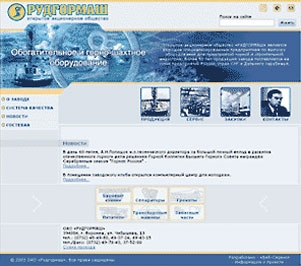 Фирменные цвета «Рудгормаша» — синий и желтый. Именно поэтому дизайн сайта выполнен в этой цветовой гамме. Главная страница сайта содержит яркий графический блок, включающий фотографию бурового станка, выпускаемого заводом. Оформление внутренних страниц сайта не перегружено графическими элементами для придания «легкости» сайту и акцентирования внимания на информационной составляющей сайта.