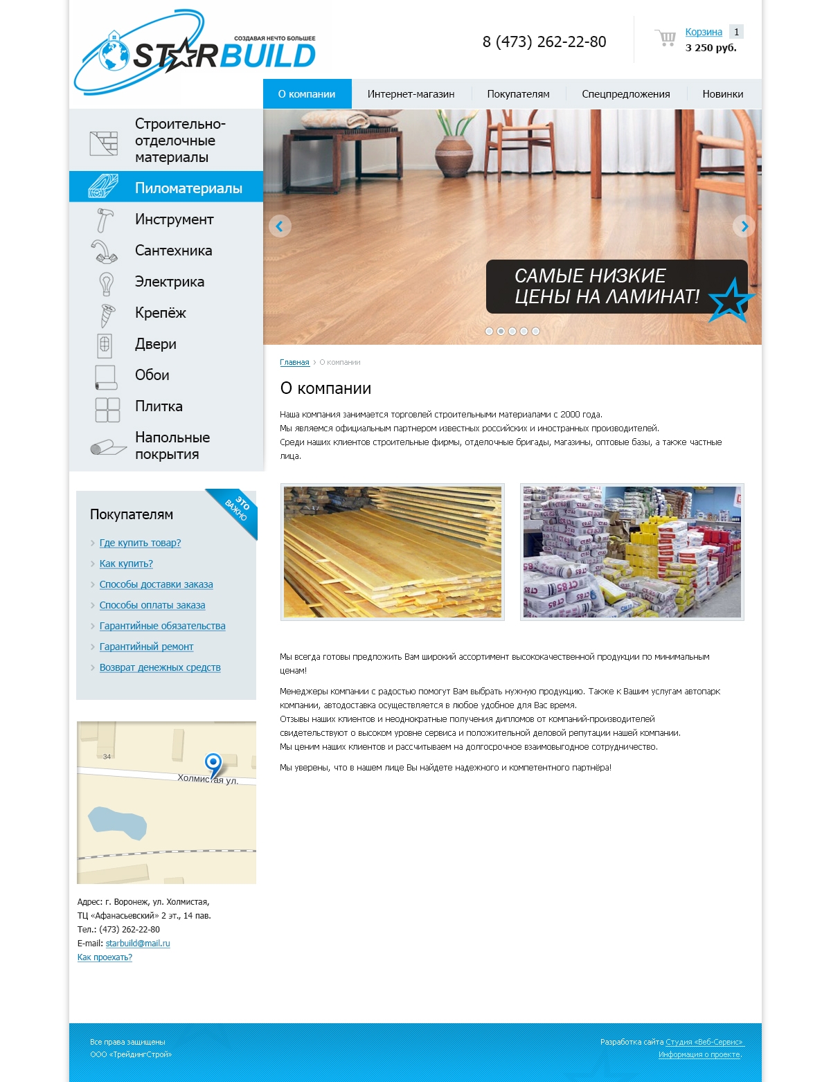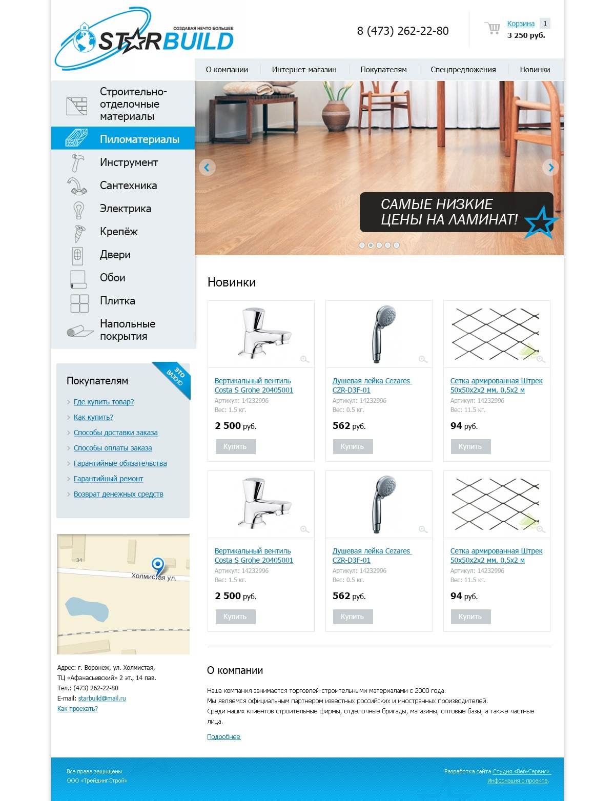 Для «Старбилд» нами был создан и реализован проект интернет-магазина строительно-отделочных материалов. Ориентир, в первую очередь, конечно, на покупателя. Поэтому на главной странице есть уже все, что необходимо для совершения заказа. Это: