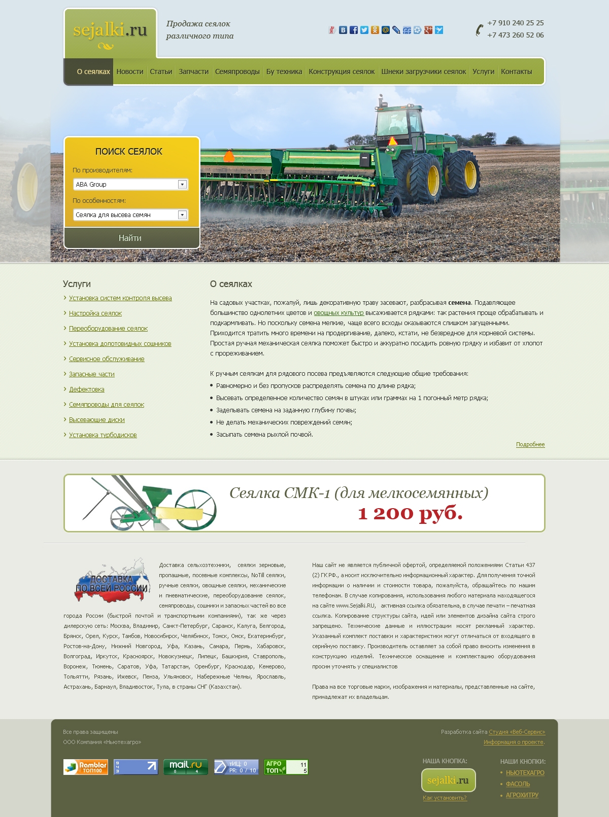 Новый сайт sejalki.ru — это путеводитель по миру сеялок. Здесь можно найти описания сеялок и технические характеристики, а также много другой полезной информации о посеве. Для тех, кто хочет найти конкретную сеялку определенного производителя, на сайте работает отличный поиск с фильтрацией «по производителям» и «по особенностям». Простой и удобный для восприятия дизайн, в сочетании с необходимым функционалом, представляет вниманию пользователя образцовый вариант сайта на сельскохозяйственную тематику.